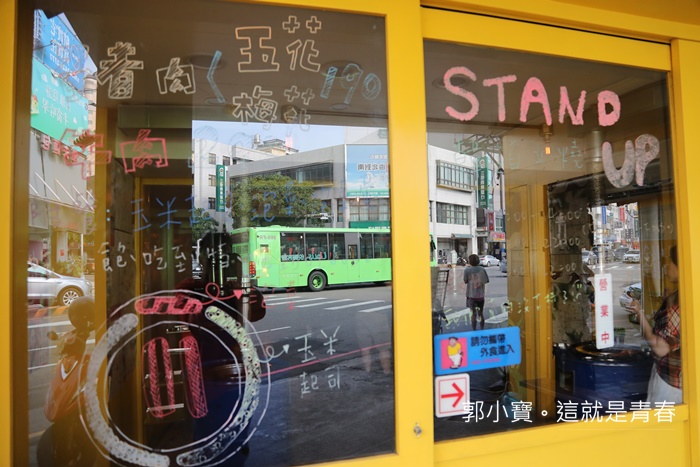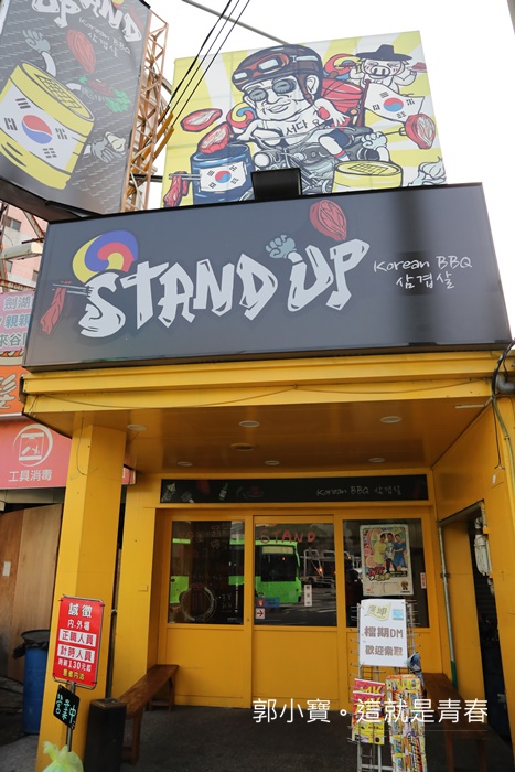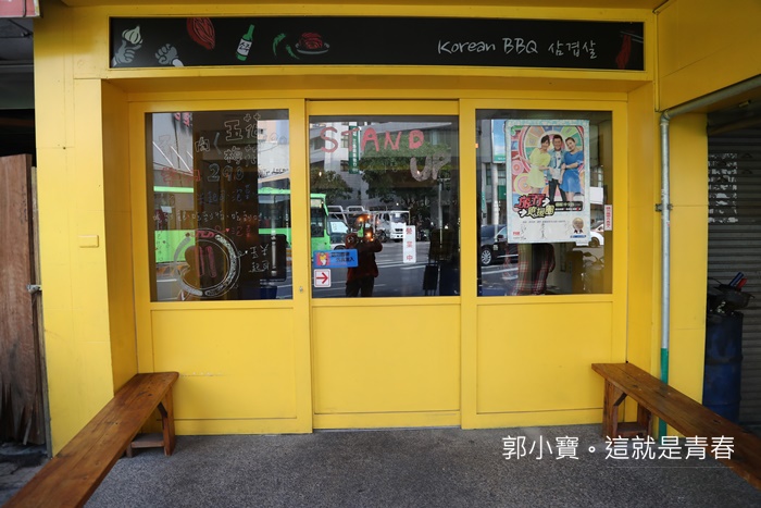 | 玻璃窗上的字已經有一點半模糊了,除了寫上營業時間跟用餐的資料以外,還特別著名我們真的沒有椅子,stand up韓道立燒是仿效韓國站著吃燒肉,提供最便宜的燒肉價位,肉的品質也相當的好而聞名。 |