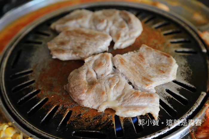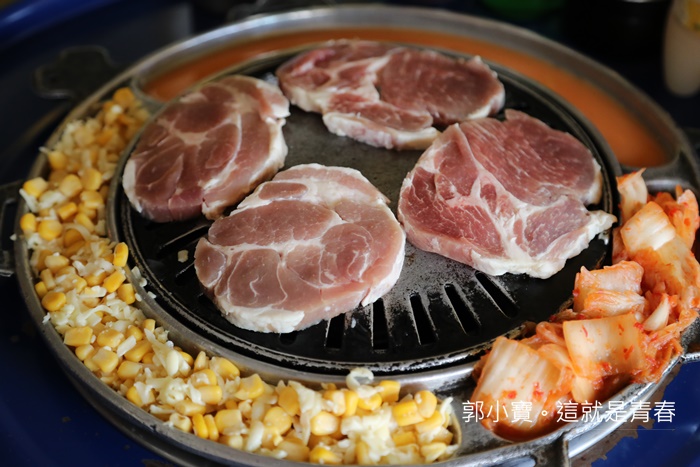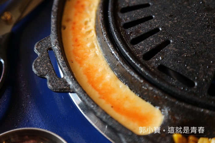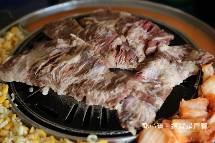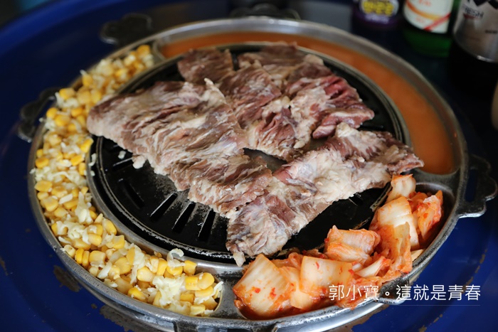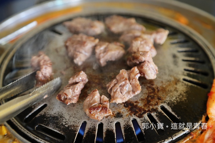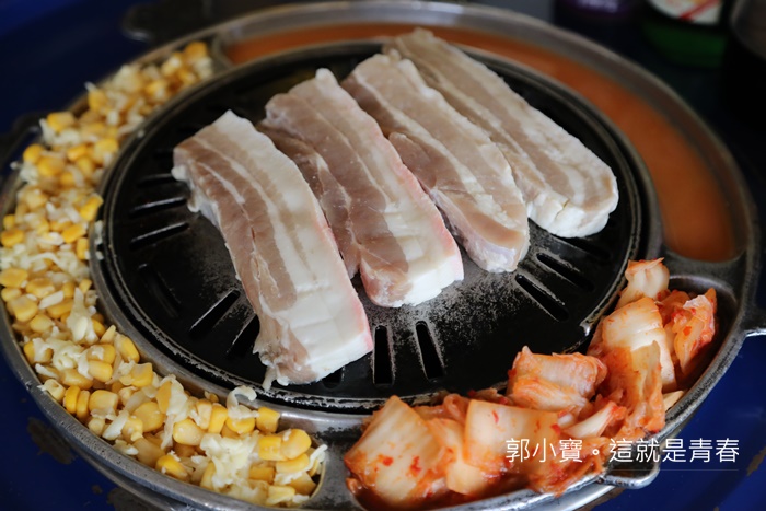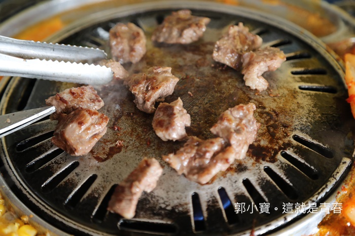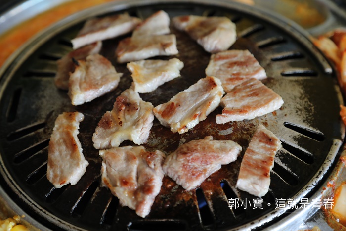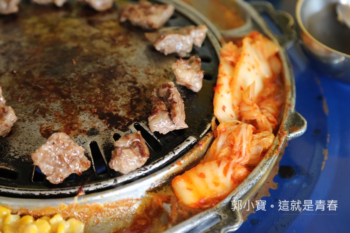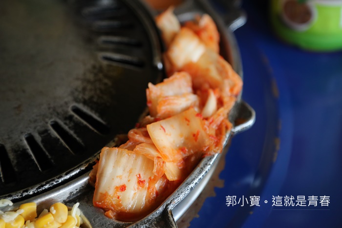 記得一個小訣竅,要注意鐵板上有一個開口,一定要面向泡菜這一邊,烤肉的肉汁會沿著開口流到泡菜,肉汁跟泡菜混合一起會讓泡菜吃起來更美味。