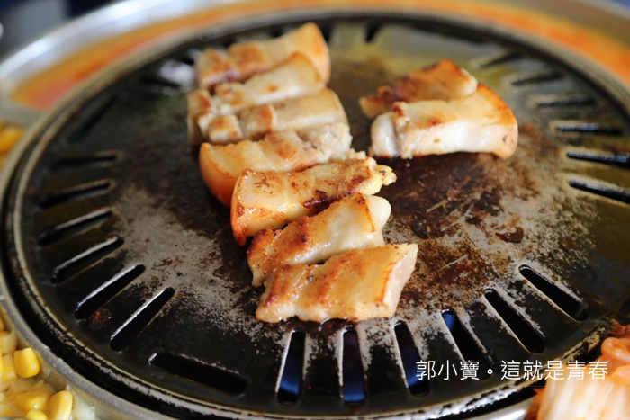 | 梅花豬比較好烤熟,一下子就可以看到粉嫩的顏色,肉汁似乎也比較多,看起來就好揪C,如果肚子餓的話真的比較推薦梅花豬,因為燒烤的時間也比較短,趕緊夾上一塊吃起來果然軟嫩,肉汁也相當多,還帶點蒜頭的味道,這味道真的拍案叫絕,有點像是小時候去牛排館吃牛排或是豬排的時候,店家都會把蒜頭放在鐵板再把肉品壓在上面的味道,只是這邊的味道跟香氣再濃了一些,真的真的超級好吃,不沾醬就讓人一塊接著一塊了。 |