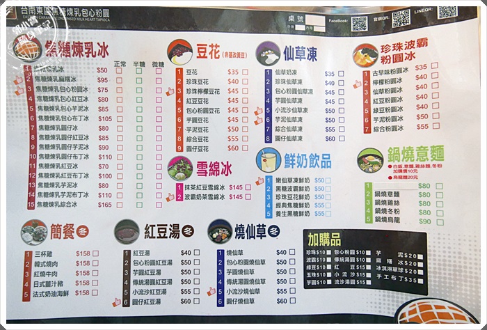 | 分類非常清楚的價目表~~最底下還有冬季才供應的餐食跟燒仙草。好啦天氣好熱~~還是來選涼涼爽爽的冰品吧!炎熱的高雄冰品店眾多,依東區包心粉圓的價位實在算有點高了,不過對於寶妹這種比較喜愛全手工製品的偏好來說,我個人是覺的很值得,畢竟吃的安心跟食材來源比較重要。 |