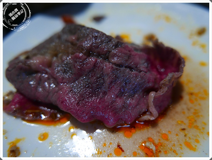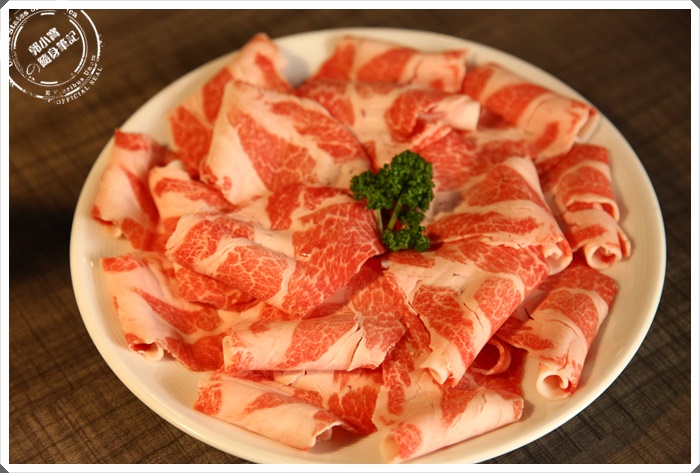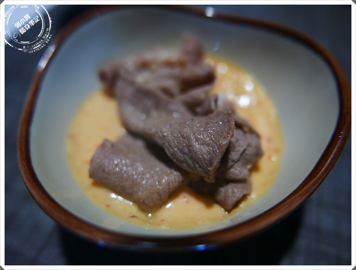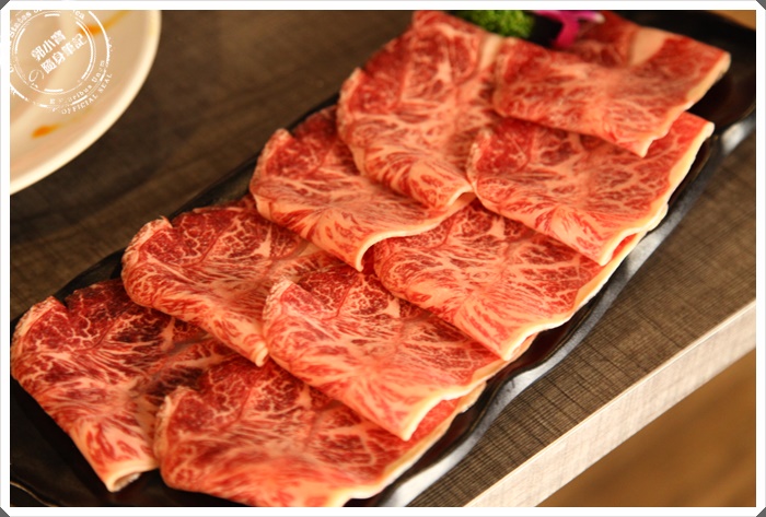 | 一看到有五代內的純血和牛肉我馬上就點了一盤,而且目前是隱藏版的,因為服務生說郭主義師傅目前還在調整菜單,以後每個月可能食材都有一些變動,所以為了吃肉趁熱,深怕一下次來不只訂不到位子還吃不到純血和牛,所以立馬點了一份,油花看起來果然漂亮,跟日本A4以上的等級差不了多少,厚度比一般的火鍋肉片在厚一點。 |