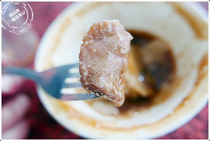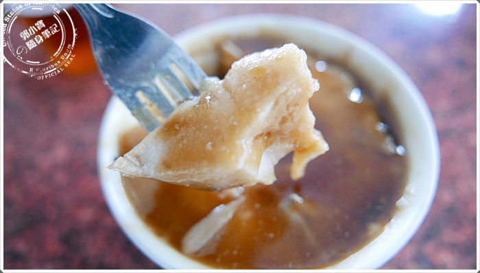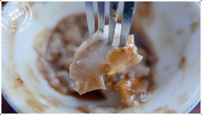 | 碗粿枝的碗粿有很多的特別之處,除了超深色的醬汁之外,就是他們的碗粿特別貼碗。黏在碗的邊緣上緊緊地不肯放過,當你用小鐵叉刮過碗的一圈你就會知道等一下的口感能有多緊實。寶妹都會刮過一圈後,再切像蛋糕狀的小切口,讓醬汁蔓延到底下美味的碗粿~~~ |