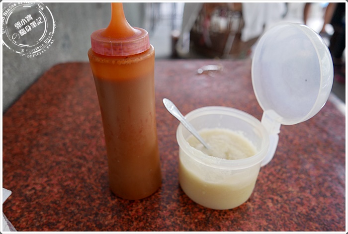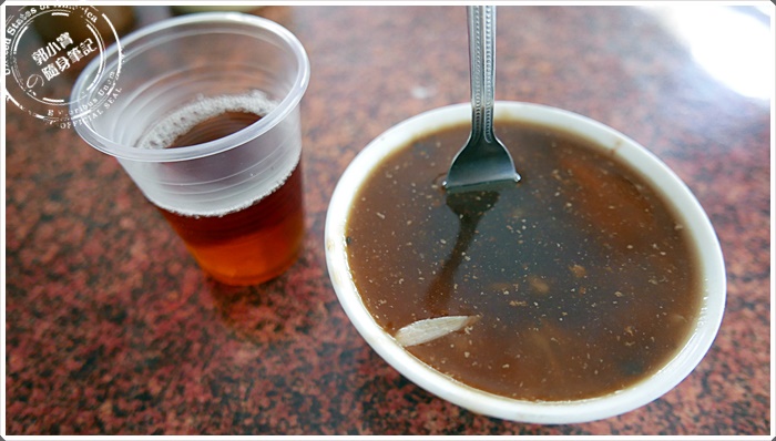 | 這樣特別的一碗碗粿在都市中卻還保持著只要25大洋就吃的到~~特別建議要內用,因為柱子旁邊有提供免費的熱紅茶或是熱麥茶~~寶妹還記得以前是用真的茶杯提供,現在客人多了只好改塑膠杯了,內用就是吃著碗粿然後配著熱茶才過癮,完全化身在早期的電影街頭一般^^ |