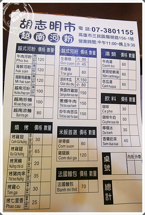 | 價目表~~進來找位置做桌上有點菜單~~每一個品項上都還有越南翻譯~~其實在國外美國地區或是一些國際度假的地點,很多飲食類別上都有PHO的出現,(PHO=河粉的英文,國外對河粉都是統稱PHO)除了河粉之外,越式小吃很對台灣人口味的還有生春捲,越式咖啡牛奶也是很不錯的選擇喔! |