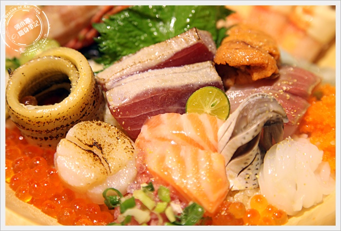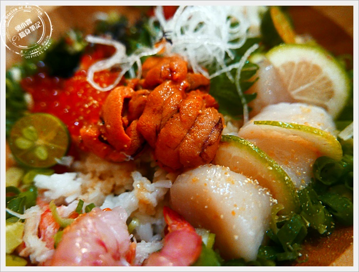 | 這是老媽指定的,因為老媽覺得生魚片吃太多她會比較覺得膩,所以選了以北海道大干貝跟松葉蟹、海膽為主軸的丼,喜歡這三樣海鮮為主的相當推薦,因為這三道海鮮的份量給的相當的多,甜蝦跟鮭魚卵瞬間變成了小配角。 |