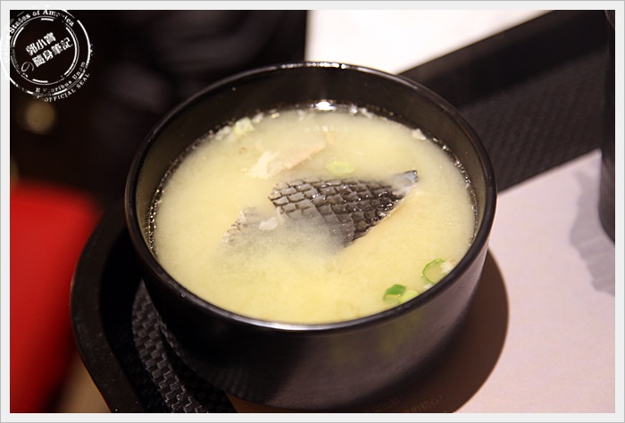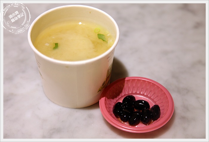 | 湯品是味噌湯,口味頗為濃郁,一開始端上來就偷喝一口,還滿燙口的,黑豆頗甜。 |