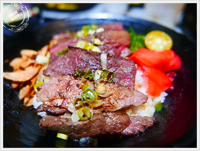 | 如果喜歡牛肉味跟血水鮮甜的朋友那就非要點這一碗鬥牛丼了,大嫂點的鬥牛丼牛肉使炙燒到半生不熟帶點血水,看起來就非常可口,後來我還忍不住偷夾了一下快來品嘗看看,順帶一提的就是他們家的牛丼系列都會在旁邊撒上一些炸蒜片,這蒜片搭配白飯夭壽下飯的,伴著醬汁一起入口真的頗為驚艷! |