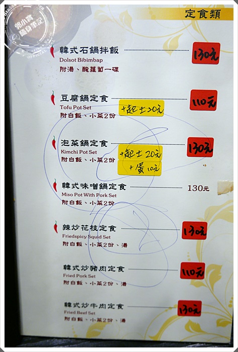 | 正確的話是這本所有品項都在上頭,為什麼寶妹很推薦李氏朝鮮館完全是因為他的價錢,簡直就是CP值大好,定食類一份也不過130大洋,反觀比較一下百貨公司設櫃的韓式韓食,光是石鍋拌飯就要180至少!!高雄在外頭寶妹吃過最划算的也還是要145上下的價格~~所以$130這價格真的是超級佛心的啦~~~而且也超適合一個人平時自己來享用阿 |
