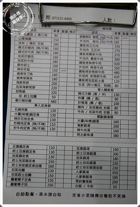 | 會給你點餐單根比自己選填~~~朋友吃了一個韓式銅盤烤肉,而寶妹點了辣炒年糕再加上石鍋拌飯(沒拍到畫線的樣子~~) |
