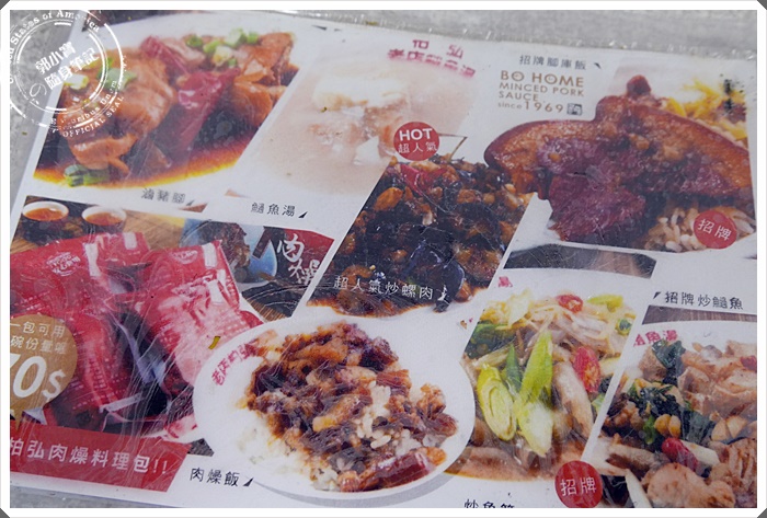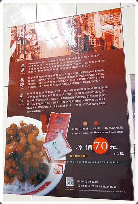 | 牆上有很多海報對於老店柏弘肉燥的簡介起源,算是在眾多高雄小吃當中多於自家品牌較有經營行銷方式的,甚至也有在賣肉燥真空包唷!懶得在家裡燉肉燥的朋友也可以購買真空包!! |
