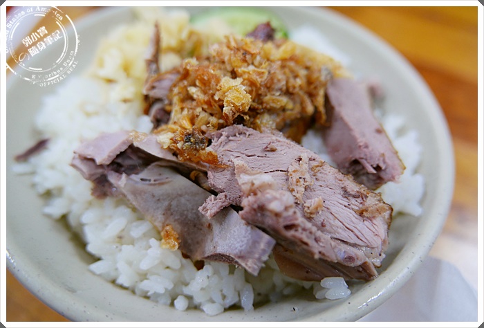 | 鄉村鴨肉飯是使用帶骨的鴨肉,煙燻過後的鴨腿肉大片的被片下來,一塊一塊地舖再沾了鴨油的鴨肉飯上,真是挺豪邁的,但吃的時候要小心一點,一不小心牙齒可能會啃到骨頭的。 |
