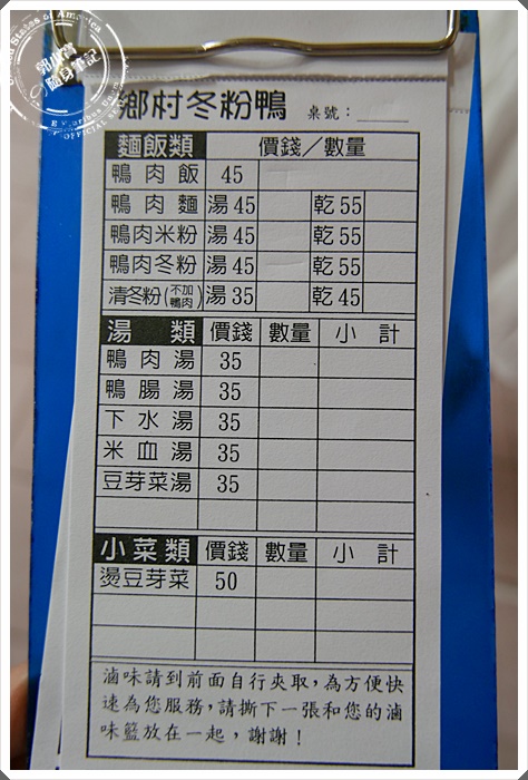 | 要先確定座位號碼在哪裡才可以點餐選小菜唷~鴨肉飯跟鴨肉冬粉絕對是這邊的大招牌,湯品的部分寶妹先是先透露一碗分量不小可以2~3個人喝,所以要先斟酌一下份量! |