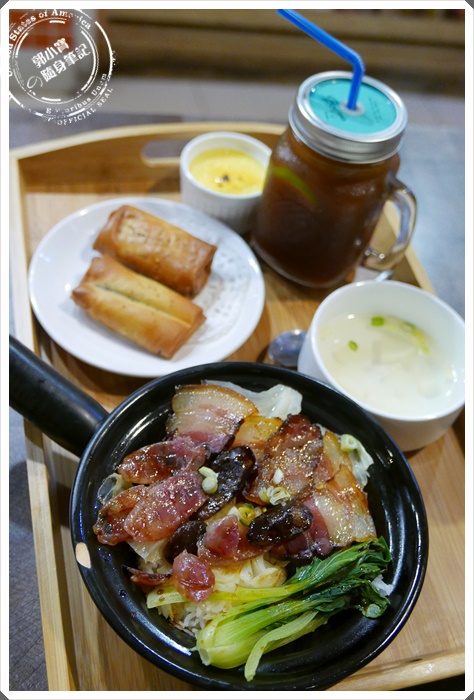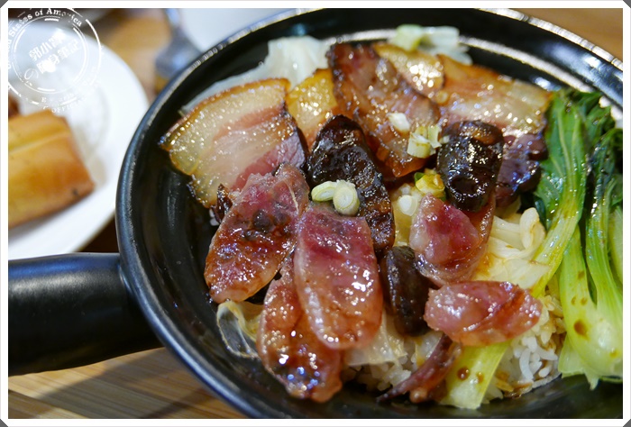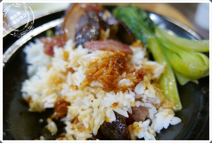 | 臘味飯有滿滿的青菜~~兩種臘腸的滋味交替感覺不至於膩口,還配上一些叉燒肉,讓整個飯看起來是澎湃又超值~~ |