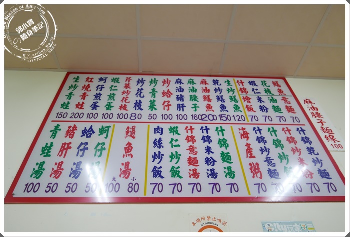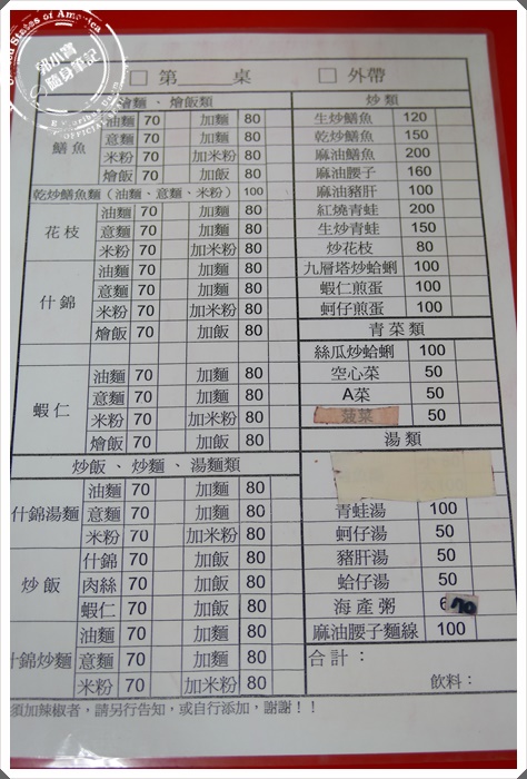 牆上有點餐單跟筆,要自己畫單子。比較特別的是她除了鱔魚意麵之外同類型的種類特別多,鱔魚花枝蝦仁什錦,還可以選擇四種主食來搭配,不見得只有意麵,種類真的特別多!