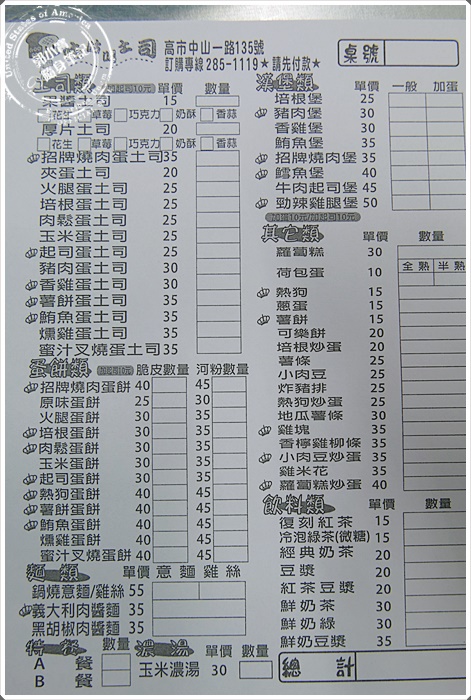 | 東西就是跟一般早餐店無異,不過意外的是價格竟然還是很便宜,開在老店老江紅茶牛奶的旁邊,不知道會不會吸引不同族群來這用餐呢??每一家早餐店都一定有他的招牌出現,仔細看看他的蛋餅非常的特別,竟然是分成脆皮跟河粉皮兩種,這就真的是比較少見的種類 |