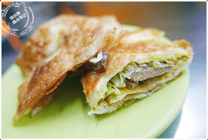 | 燒肉片還有高麗菜絲在配上少許的美乃滋,肉片我覺得還不錯,比起其他依樣賣燒肉類的早餐店口感嫩上許多,但是高麗菜絲就沒有寶妹心中第一名的脆皮蛋餅的店來的多(下次再分享唷)~~這一點比較可惜。 |