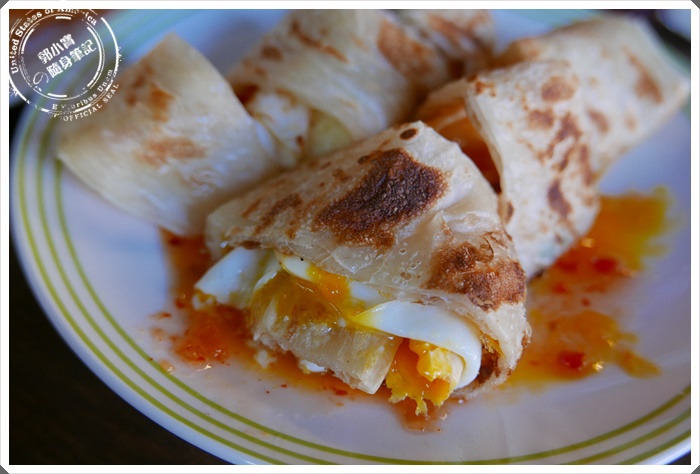 少了泰式醬料,剩下的就是比較一般口味的原味蛋餅,但是讓人超意外的是,他竟然是爆漿的,半熟蛋黃流出來跟著餅皮一起吃實在是太銷魂了啦~整桌的朋友都對他的蛋餅讚不絕口 |