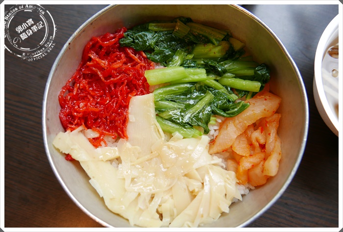 | 把雞腿跟排骨移開之後底下有四種配菜~~豆枝、筍絲還有蘿蔔乾加上一種季節時蔬,再底下就是白飯,飯菜都不油膩,溫溫的在山上吃感覺很舒服唷! |