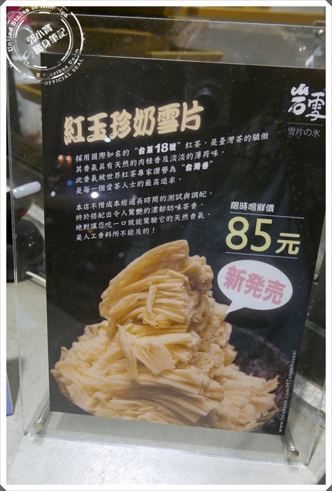| 這個讓部落客格友們超愛的隱藏版紅玉珍奶雪片~原本沒有在菜單上,跟店員聊了一下才知道賣到只好浮上檯面,不過其實每個口味都算是限量版的,每一次生產冰磚都只能有十幾顆冰磚~~所以其實賣光只能隔天請早了哈哈哈~~使用台茶18號的紅茶做底,店家也很建議如果第一次吃可以先嘗試這個口味看看,寶妹當然不猶豫的要選這個口味~~ |