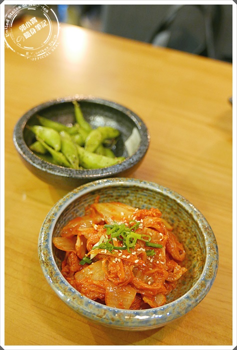 | 首先都會給盤毛豆當小菜,泡菜則是我們自己點的,比較不是走濃辣系列,而是比較酸辣的泡菜口感,但也非常多汁唷 |