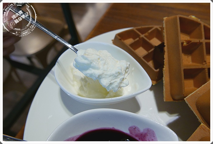 | 奶油的部分更是讓我和朋友驚艷,友人是完全不吃甜食的人,竟然大口的稱讚奶油好吃不膩口,寶妹實在是太好奇他那綿密香濃有如卡士達醬的口感,抓了老闆來問問才知道是使用動物性奶油來製作,少了植物性奶油的油膩口感,換得的是純正香濃的奶油來搭配厲害的鬆餅~~ |