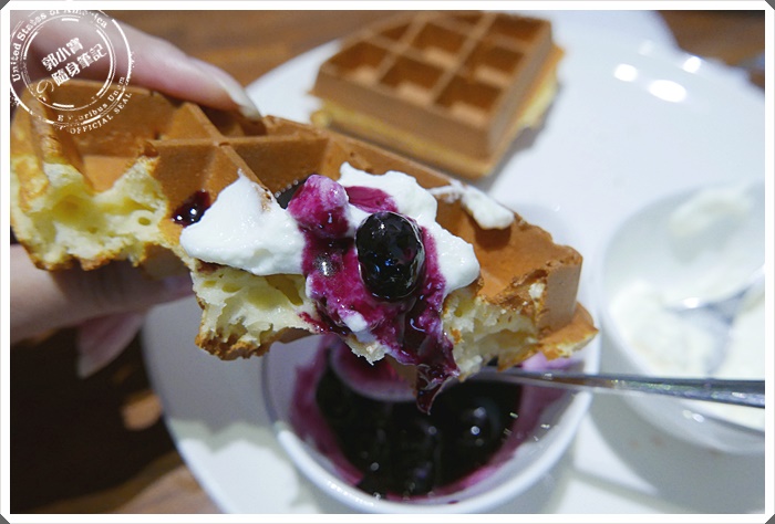 | 烤得超漂亮的雙享鬆餅,每一片鬆餅的每一格是烤得如此完美細緻,真正好功夫阿~~配上兩種不同的配料,光是鬆餅擺盤就很視覺感~~ |
