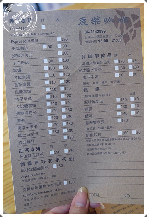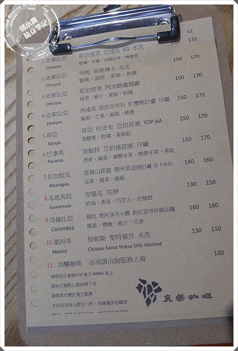 | 牛皮紙底的點餐單,質感大大的提升。種類並不多,主要是供應單品咖啡以及鬆餅類 |