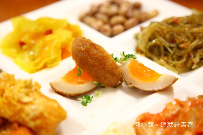 | 因為小菜真的太多,所以就直接上了九宮格,是和風鯛魚皮真的滿厲害的,還有炸蛋也相當的不錯,其他的泡菜跟豆干都有在水準之上,下次來我應該會主攻它們家的海蜇皮! |