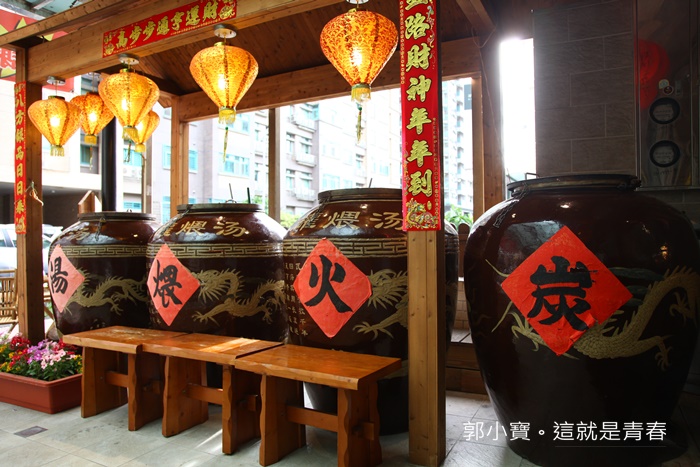 | 外面的四座大陶缸就是煨湯最主要的器具,底下用炭火這樣慢慢地煨湯,把精華都逼了出來,一想到那湯頭我就要快受不了了,一般的湯品都是用直火直接煮,但是煨湯是用陶缸內的炭火讓整個陶缸的溫度加溫,慢慢地利用陶缸內的高溫把精華慢慢的煨出來。 |