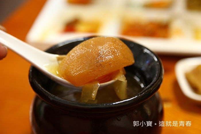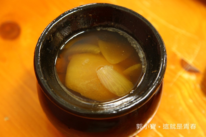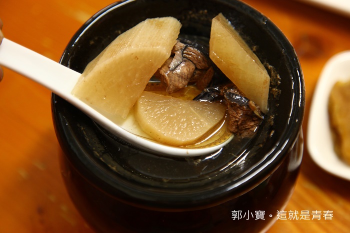 | 三代同堂就是白蘿蔔跟菜脯、老菜脯三種一起去煨煮,一掀開的時候被上面那一層的油脂驚嘆到,白蘿蔔的鮮甜根老菜脯的鹹味很搭口,基本本身跟雞肉搭配,是這一家店的招牌湯品,果然一喝就欲罷不能。 |