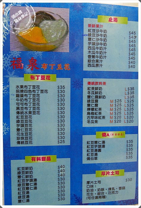 | 說到福泉大家都會自動把雪花冰跟他連結再一起,可以說是雪花冰老字號做的相當的成功阿,道地的就都會知道要來福泉,而不是到對面的觀光勝地去吃冰(噓),看你說吃哪家冰就知道你有沒有做功課!福泉也從民國70年營業至今,已經是不折不扣的老冰店啦 |