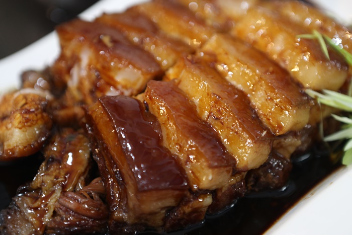 | 看到這東坡肉就讓我食指大動了,據說這東坡肉不輸給有東破肉高手第一美譽的范添美師傅,好像是師出同門的樣子,看賣相確實相當有水準,底下的醬汁濃稠勾香,肉品上色也上的相當漂亮。 |