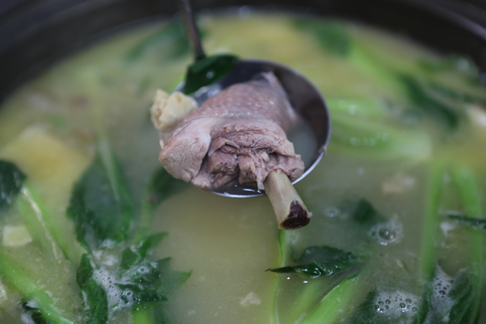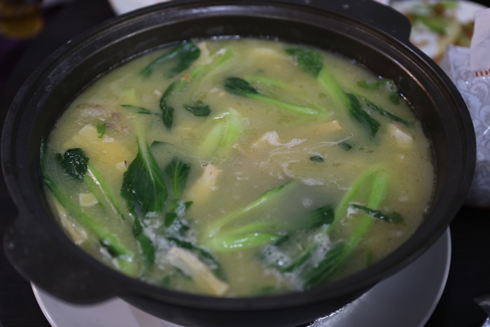 | 這一鍋湯幾乎大家搶著喝,這鍋雞湯真的甘醇順口,濃濃的燉煮雞湯的風味完全表露無遺,一喝保證就會愛上,喝完也不會覺得口渴,真的相當的美味,最後還加湯讓我們打包帶走,好喝得要命! |