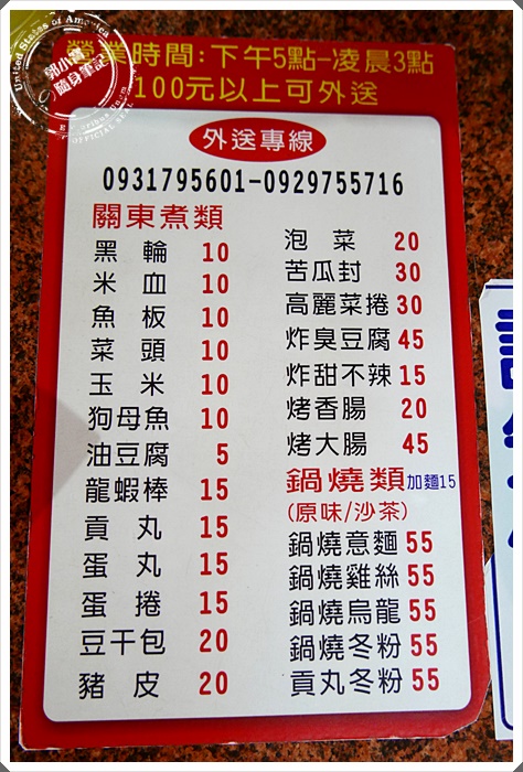 | 厲害的是他100快就可以外送了~~範圍的話嘛還是要打電話問晚上顧攤的兩位大哥。除了黑輪以外,還有鍋燒意麵類,炸黑輪炸臭豆腐,烤香腸大腸都全部包辦,算是種類非常多元化 |