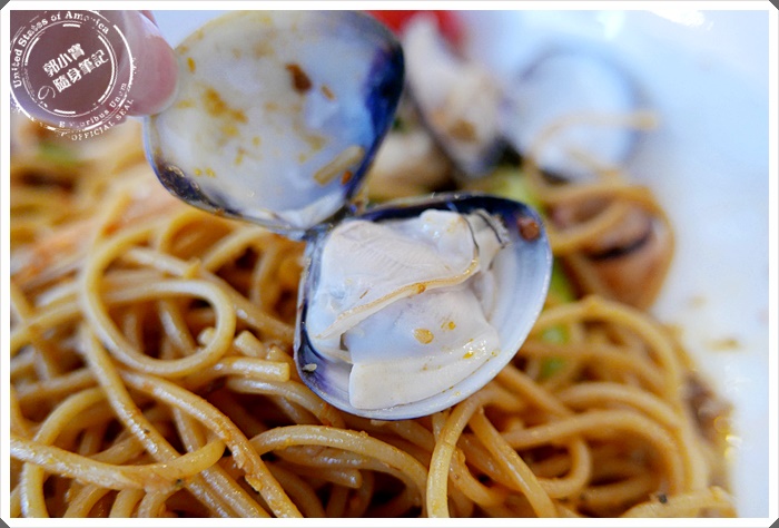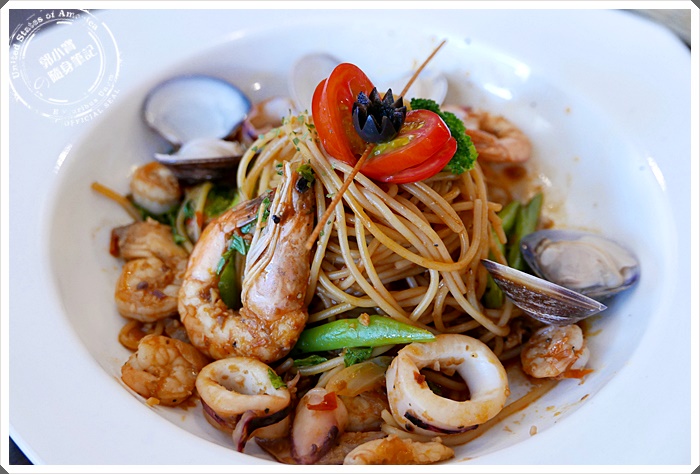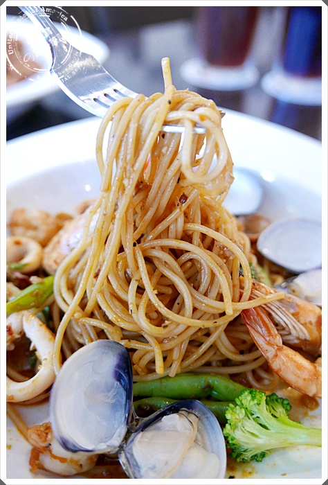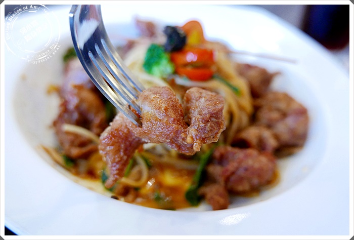 | 寶妹本來要點的今天竟然售完沒供應...還真會選= =,只好跟朋友吃一樣泰式底的義大利麵,今天選擇的則是泰式海鮮義大利麵$280 |