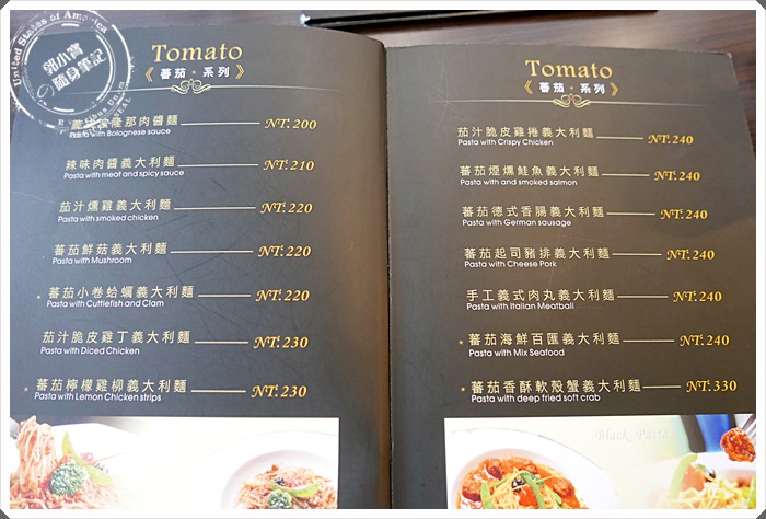 | 點餐單超大一本,這邊光是番茄茄汁類的餐點就有滿滿兩頁可以選擇,足足有14種之多,竟然寫稿的時候才發現有一道是香酥軟殼蟹?!完全沒有發現他阿~~太可惜了 |