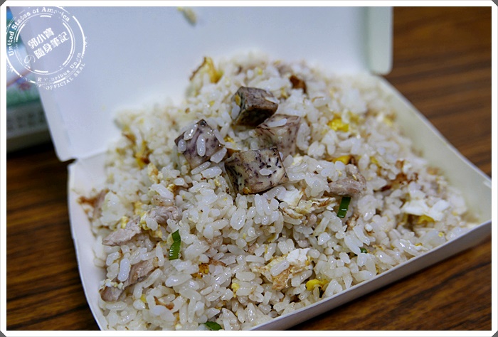 | 這是同事的"芋頭肉絲炒飯"攔截他飢腸轆轆的肚子來借拍一下,分量依舊是滿滿的一盒,飯就是單純的炒鹽巴跟蔥花蛋,不過就連米飯的部分也能夠帶著淡淡的芋頭香氣唷 |