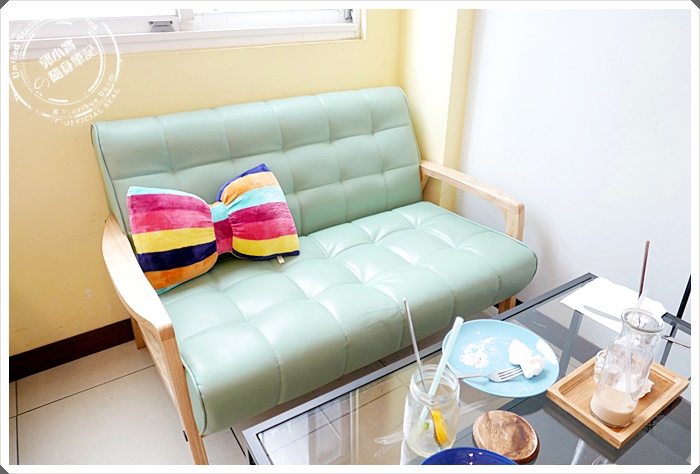 | 今天真的很幸運的竟然還有坐到盡頭的沙發區,好喜歡這種木頭配上粉綠色的雙人沙發座~在配上一個彩虹色的小抱枕,整個下午的心情都愉悅了起來~(請忽略還沒被收桌的餐盤) |