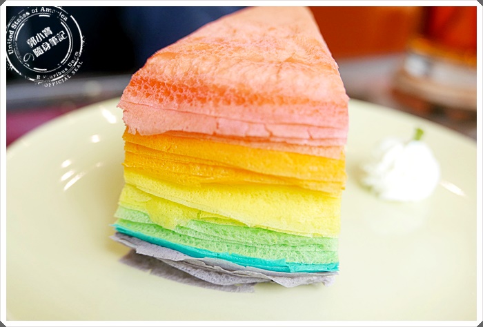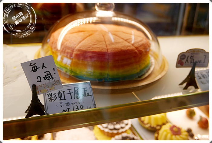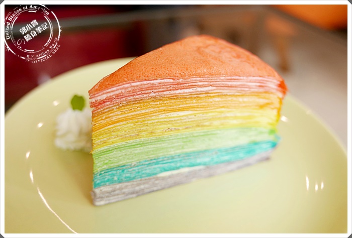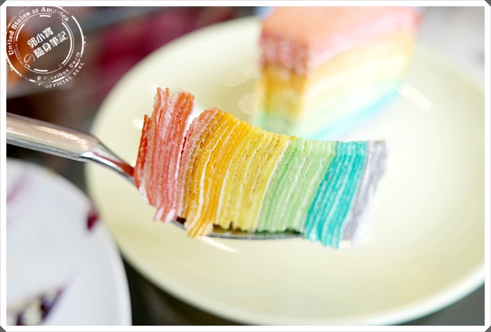 | 重點終於登場啦~~~彩虹千層派$130,一層一層的層次非常明顯又整齊,表示店家的製造能力很穩定功力又好,寶妹在國外吃過千層蛋糕名店Lady M,比較起來的話飽食甜點坊的並不會死甜,一個人吃完一整個是絕對沒問題的,反而不會過於奶味更耐吃~ |