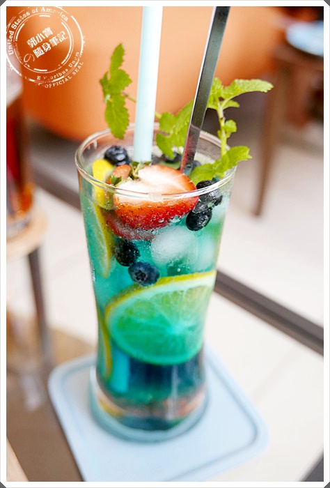 | 這杯藍莓柑橘薄荷氣泡飲$180,寶妹真的是超級真心大推薦,不但好喝又順口,整體的配色及用心無限多,底層有使用鳳梨果醬鋪底,藍柑橘及薄荷加上氣泡水,玻璃杯的旁邊用柳橙片鋪滿了整個杯壁,加上藍莓跟薄荷葉點綴,這樣就算這個價錢我也心甘情願,真的是超級好喝^^ |