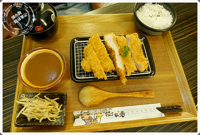 | 首先是朋友的炸里肌肉豬排飯,配上了味增湯、白飯、小菜、還有另外端上的高麗菜絲,整個一頓下來是十分的豐盛,朋友選擇的則是咖哩醬,不管是配上香酥的豬排或是配白飯都很優秀 |