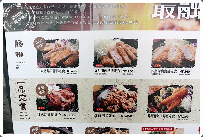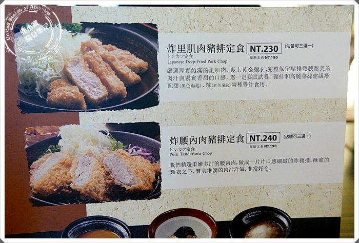| 門口就有大看板了~~等待的時候就可以一邊先選擇,照片上的是超熱賣的幾種款式,里肌肉豬排跟腰內肉豬排,甚至是炸雞腿定食一直都是寶妹很常點的定食類。 |