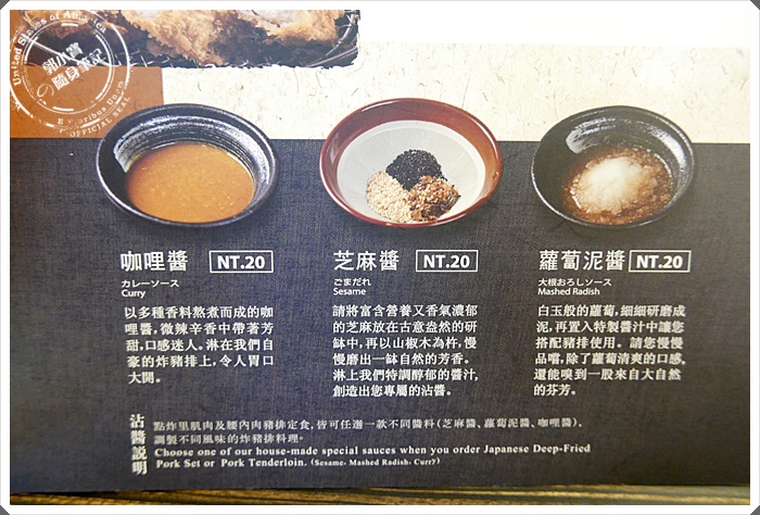 | 豬排的醬料有三種可以任你選擇,咖哩醬比較香濃適合喜歡重口味的朋友,芝麻醬是現磨的芝麻再加上桌邊附贈的豬排醬,蘿蔔泥則是比較清爽的日式口感,怕油膩的就可以選擇蘿蔔泥 |