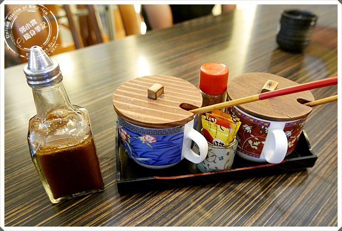 | 桌上都有這樣一整組的調味品,左邊的是日式和風的沙拉醬,用來配高麗菜絲的,另外就是有兩種豬排醬可以選擇,一種會比較淡一種是比較重口味,但其實寶妹雖然很喜歡他們家豬排醬但其實兩種吃不太出來分別~每次如果加上豬排醬都是喜歡兩種一起混和XDDD |
