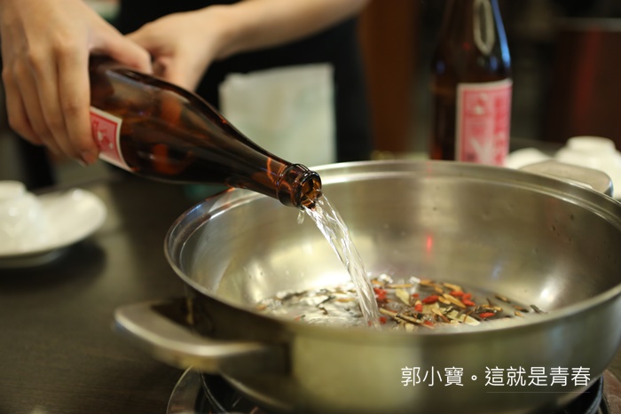 | 可愛的店員妹妹放入了中藥材後再倒入料理米酒,整個湯頭全部都是米酒,這冬天吃起來就是相當的舒服,每到冬天薑母鴨跟燒酒雞就是我的最愛啊! |