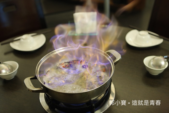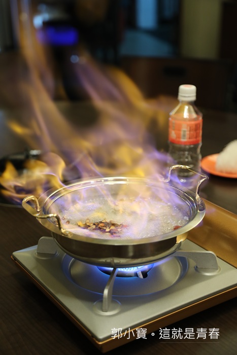 | 點火將酒精快速揮發,順便看了一場精采的秀,說真的因為鍋子滿大的,加上純米酒湯頭,一點火的瞬間真的有點震撼,因為火還滿大的,如果有帶小朋友的話可能要小心一點唷XD