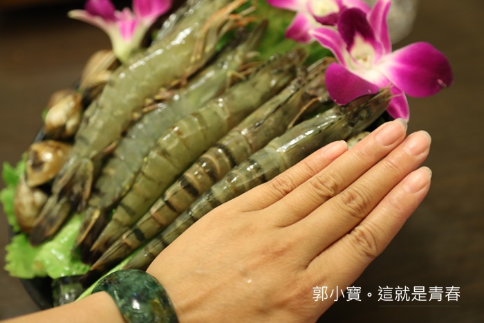 | 六隻跟手掌將近一樣大的大草蝦真的還滿驚人的,旁邊還有一些蛤仔,一整個超豐富的,除了有主盤以外,還有蔬菜盤,飯跟冬粉則一,個人一樣推薦點飯,然後吃完食材在把白飯下去熬煮成雜炊真的很美味! |