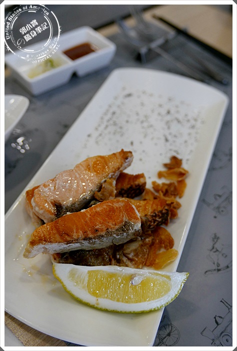 今天提供的是鮭魚,不會很油膩,但提供的分量都少少的,吃起來較清爽很適合中午的時候用餐,淋上一些檸檬以及主廚特製的蒜片就非常提味! |