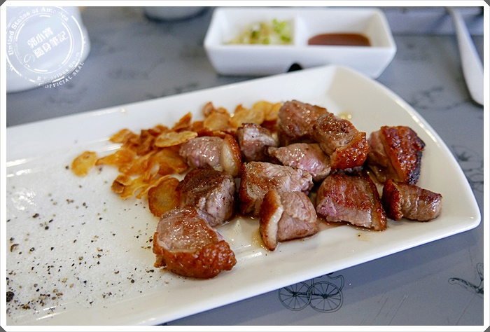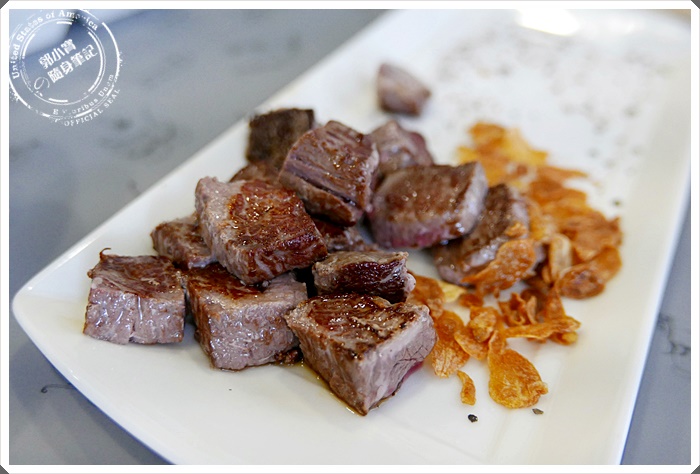 | 再來朋友點了鴕鳥菲力來嘗試看看,外頭比較常看到的是鴕鳥肉片或是比較散狀的樣子~寶妹嘗試了一口,還是跟牛肉菲力有著大不同口感,但也不像點羊排那樣的羊騷味,有些介於中間,以全熟來說算是很嫩的口感,搭配味增醬或是搭配蒜片一起吃都是很棒的體驗。 |