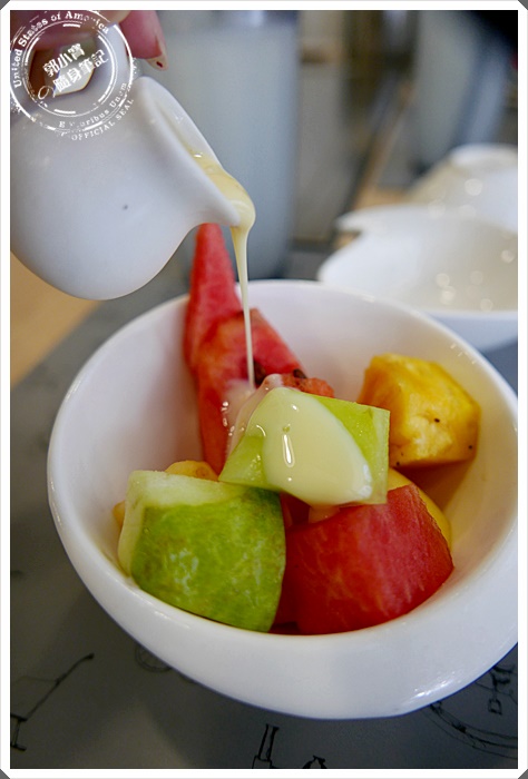 | 首先上來的是水果優格沙拉,今天提供的醬料是百香果優格醬,水果很新鮮,百香果優格醬很對寶妹的嘴,微微酸酸地口感在超早的11點午餐當中非常醒胃,就把水果沙拉當早餐了@@ |